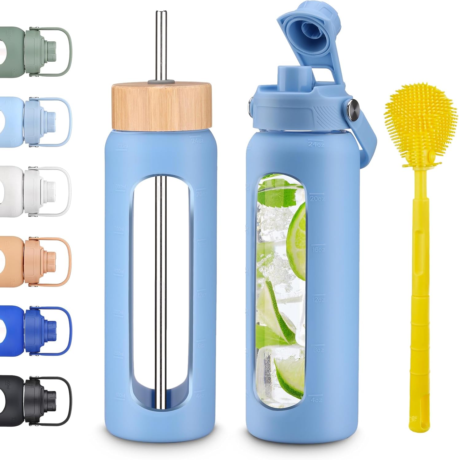 - PURE & DURABLE: Our borosilicate glass water bottle is free from BPA, BPS, PVC, and lead. The stylish silicone sleeve adds extra protection against slips and falls, while the thicker base makes the glass water bottles 32oz less prone to breakage than regular glass