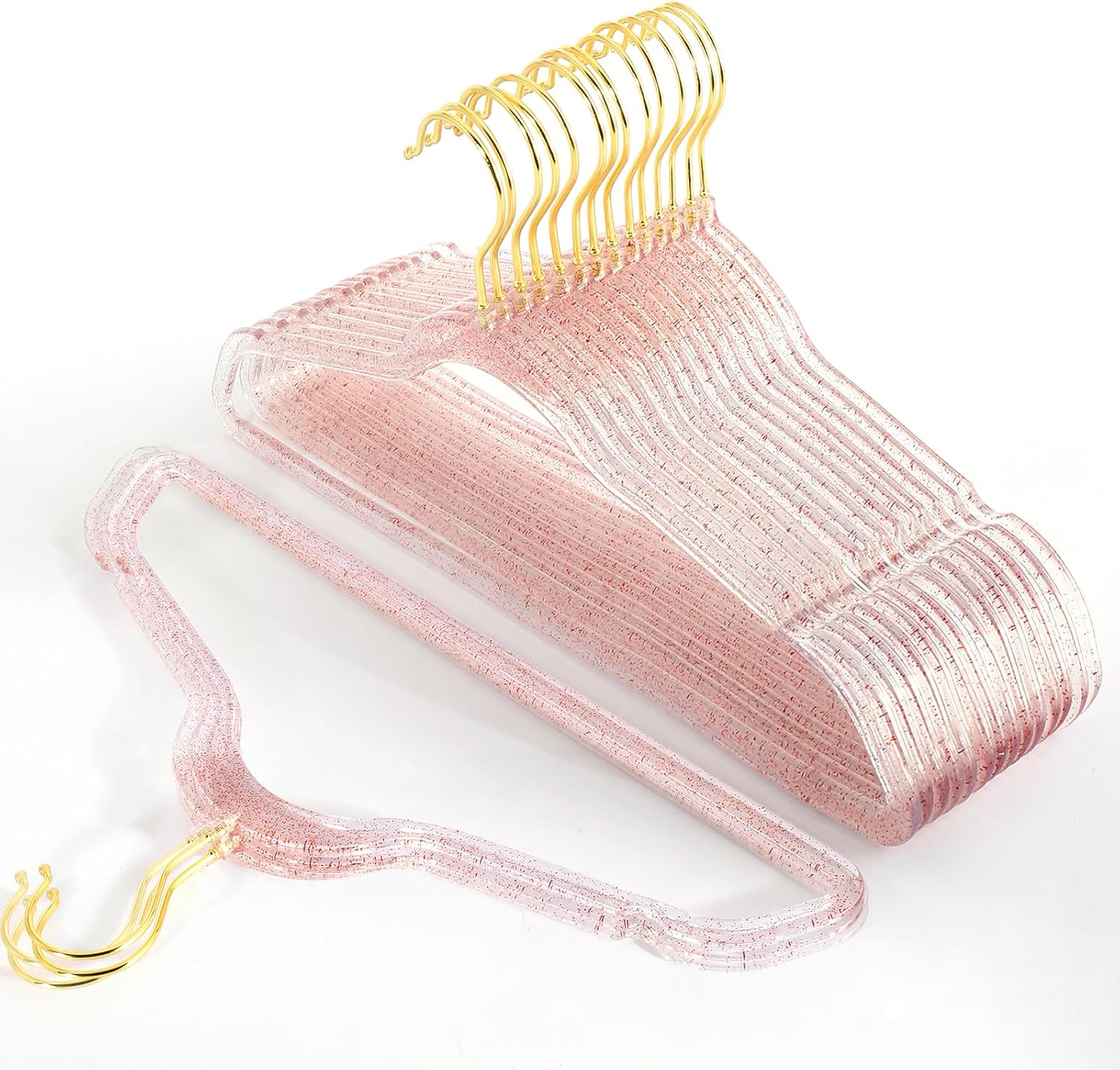 - Anti-slip features: Never worry about clothes slipping off the hanger again, Acrylic Glitter Hangers with non-slip shoulders that keep your clothes in place.