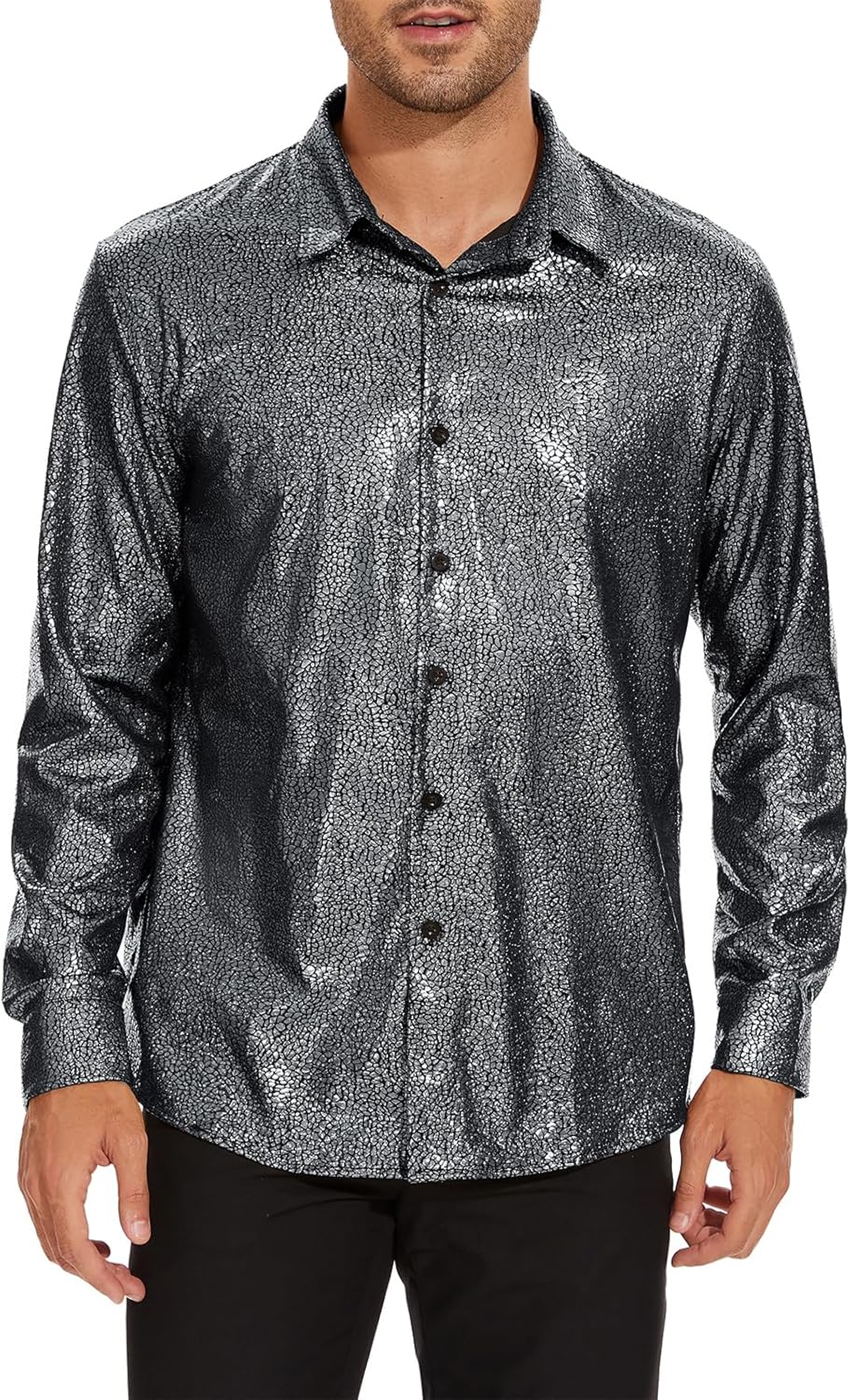 American Trends Mens Disco Outfits Shirts Sequins Long Sleeve Metallic Button Down Shirt 70s Outfits for Men Party Costume