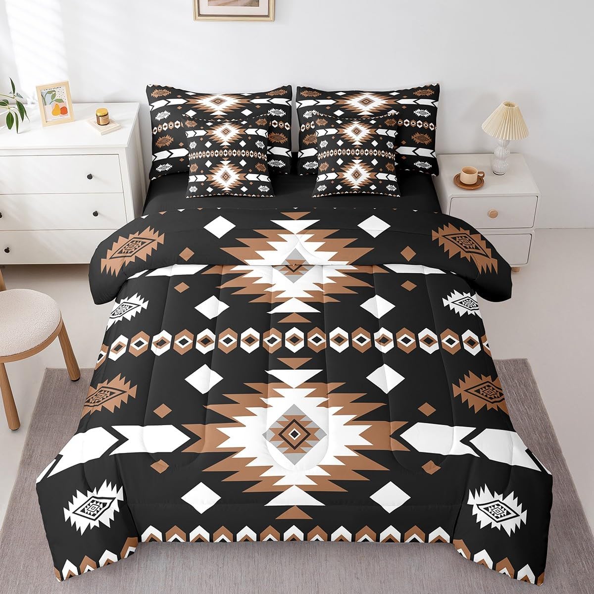 Feelyou Bohemian Geometric 7 Piece Bedding Set Queen Size Western Aztec Comforter Set with Sheets for Kids Boys Girls Teens Vintage Themed Bed in a Bag Rustic Black Brown Bed Set