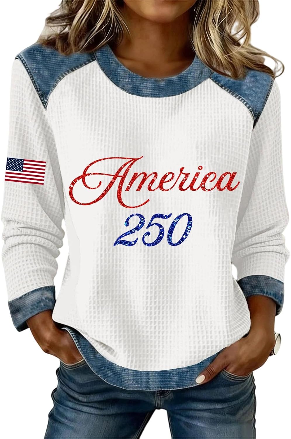 250 Anniversary USA Shirt Womens Waffle Knit America 1776-2026 250th Anniversary American Shirts Patriotic Pullover