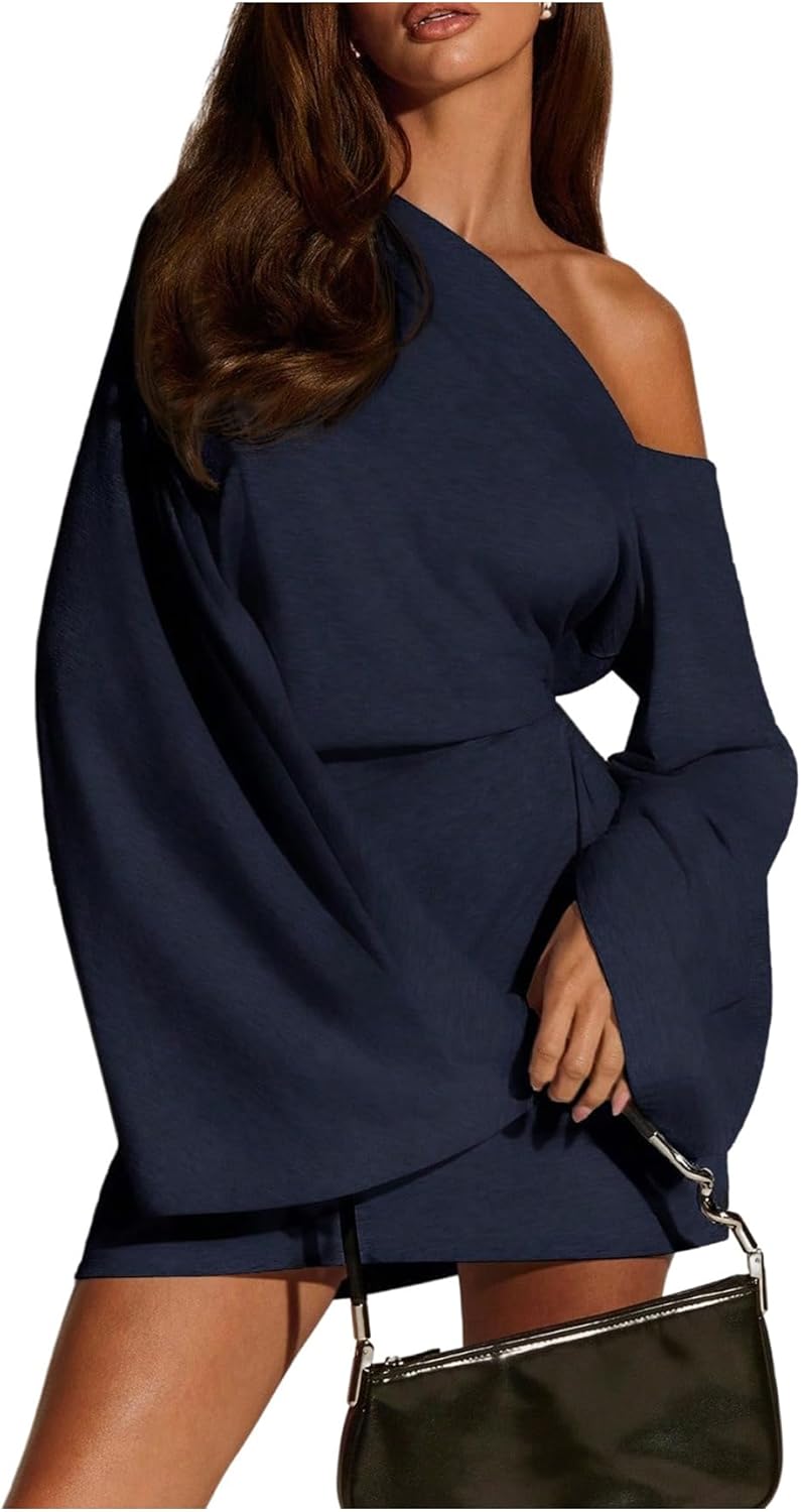 SOLY HUX Women's Asymmetrical Mini Dress Off The Shoulder Long Sleeve Casual Bodycon Dresses Pure Dark Blue Medium