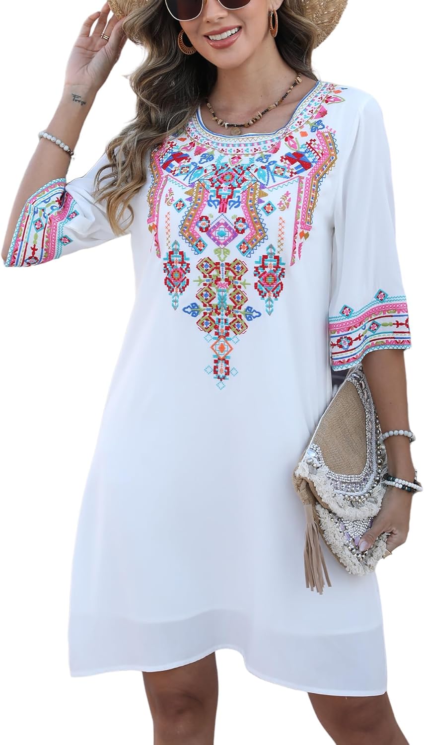 Higustar Women's Mexican Embroidered Dress Plus Size Bohemian Hippie Peasant Boho Floral Traditional Fiesta Dresses