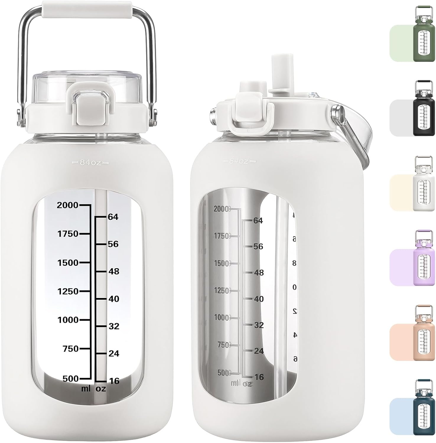 MUKOKO 84oz Glass Water Bottle with Time Marker and Silicone Sleeve 2.5L Water Jug with Stainless Steel Handle Gallon Drinking Bottle with 2-in-1 Lid Wide Mouth BPA Free, White
