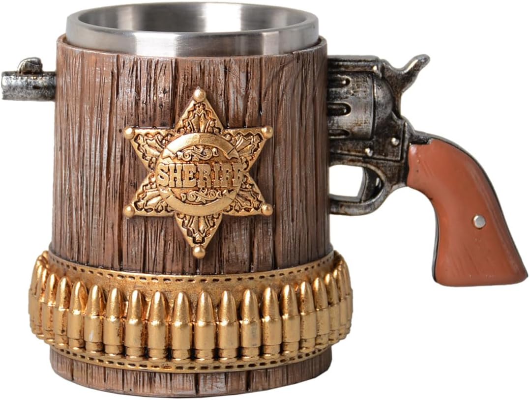 HAUCOZE Beer Stein Mug - Double-Wall Insulated Stainless Steel Coffee Drinking Cup with Handle,15oz,Sheriff Design for Oktoberfest Gifts and Collectibles