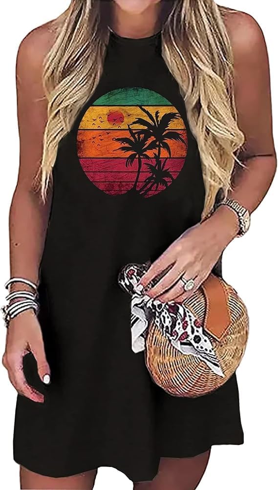 Sun Salt Sand Coconut Tree Tank Mini Dress for Women Sleeveless Beach Praty Shirts Summer Vacation Short Mini Dresses
