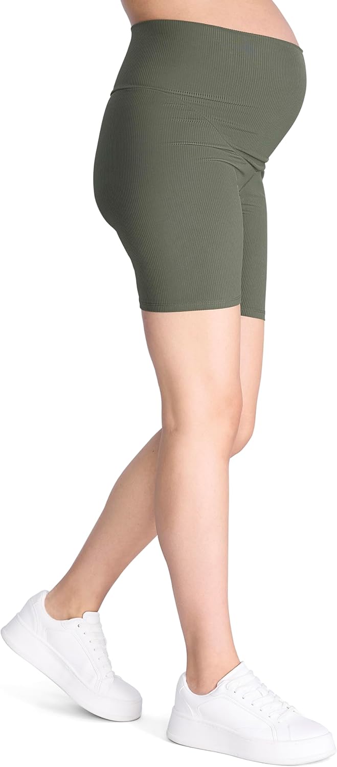 Motherhood Maternity Womens Over The Belly Ribbed Biker Pregnancy Workout Shorts