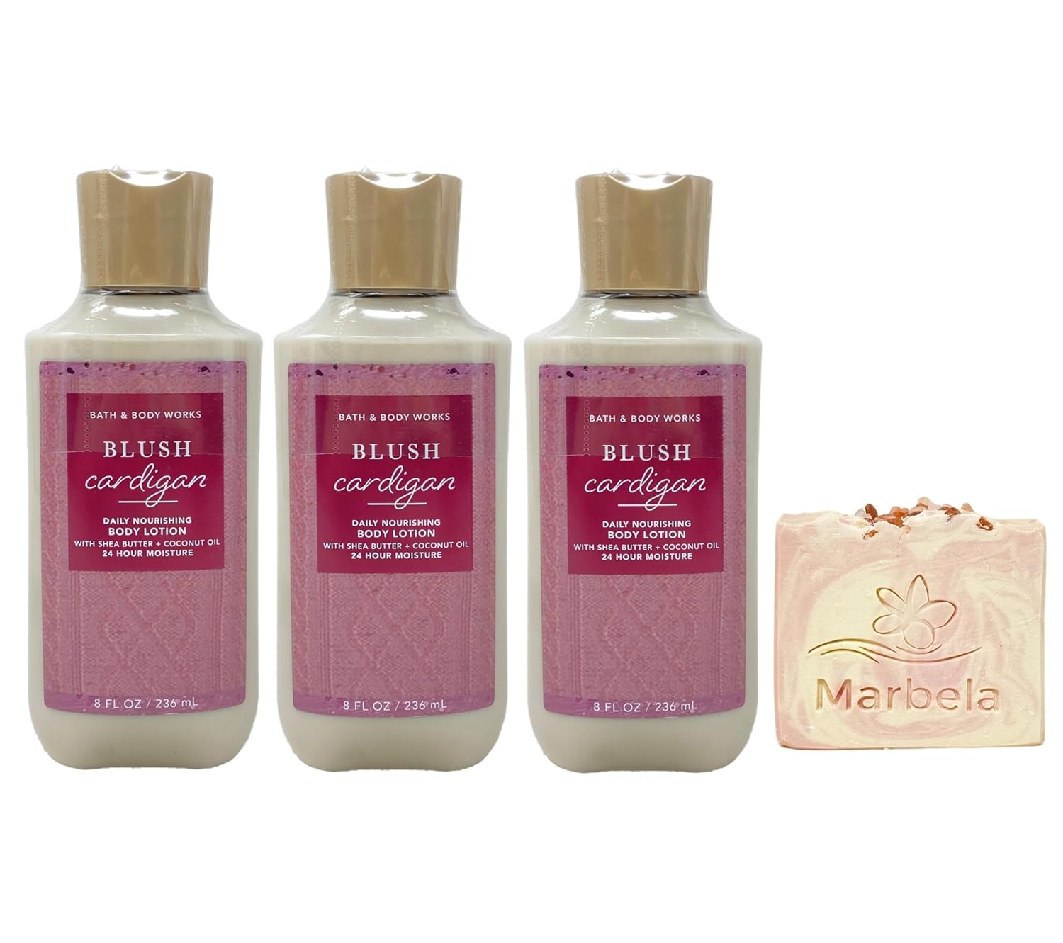 - Bath & Body Works Blush Cardigan Body Lotion Set with a 4 oz Marbela Himalayan Salts Springs Bar Soap (Soap May Vary).