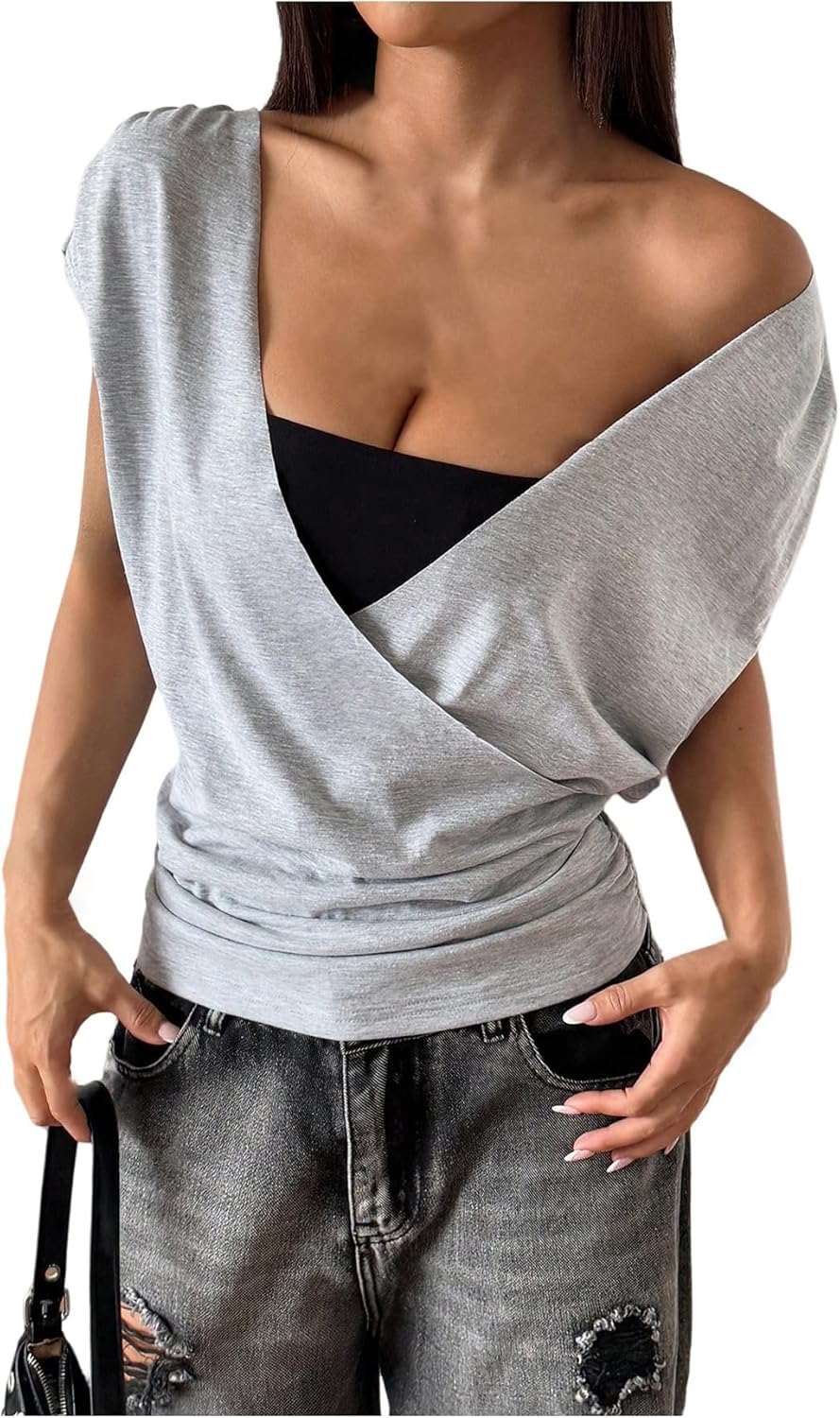 Verdusa Women's Wrap V Neck Ruched T Shirts Short Sleeve Going Out Tops