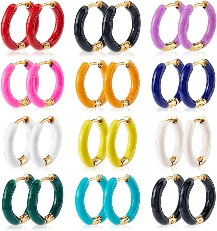 DICOSMETIC 24Pcs 12 Colors Colorful Enamel Hoop Earrings Golden Huggie Hoop Earrings 12mm Small Cute Statement Earrings Stainless Steel Earrings Set Fashion Jewelry for Women