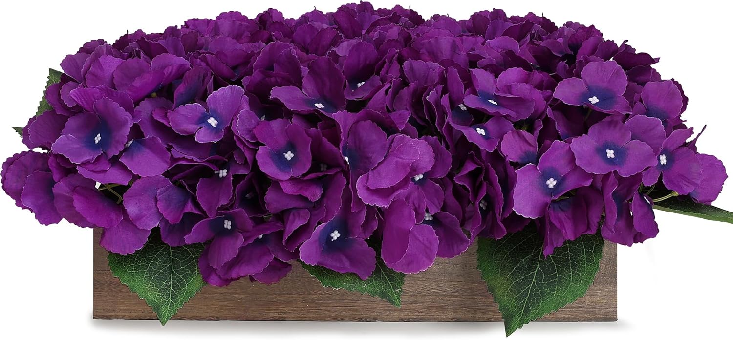 - Attractive and unique design. This fake flower table centerpieces with wooden tray size is 14.7’’ X 5.3’’ X 6.3’’, wooden planter blooms lush hydrangea with leaves, the purple color bringing more elegance and mystery to your dining room table.