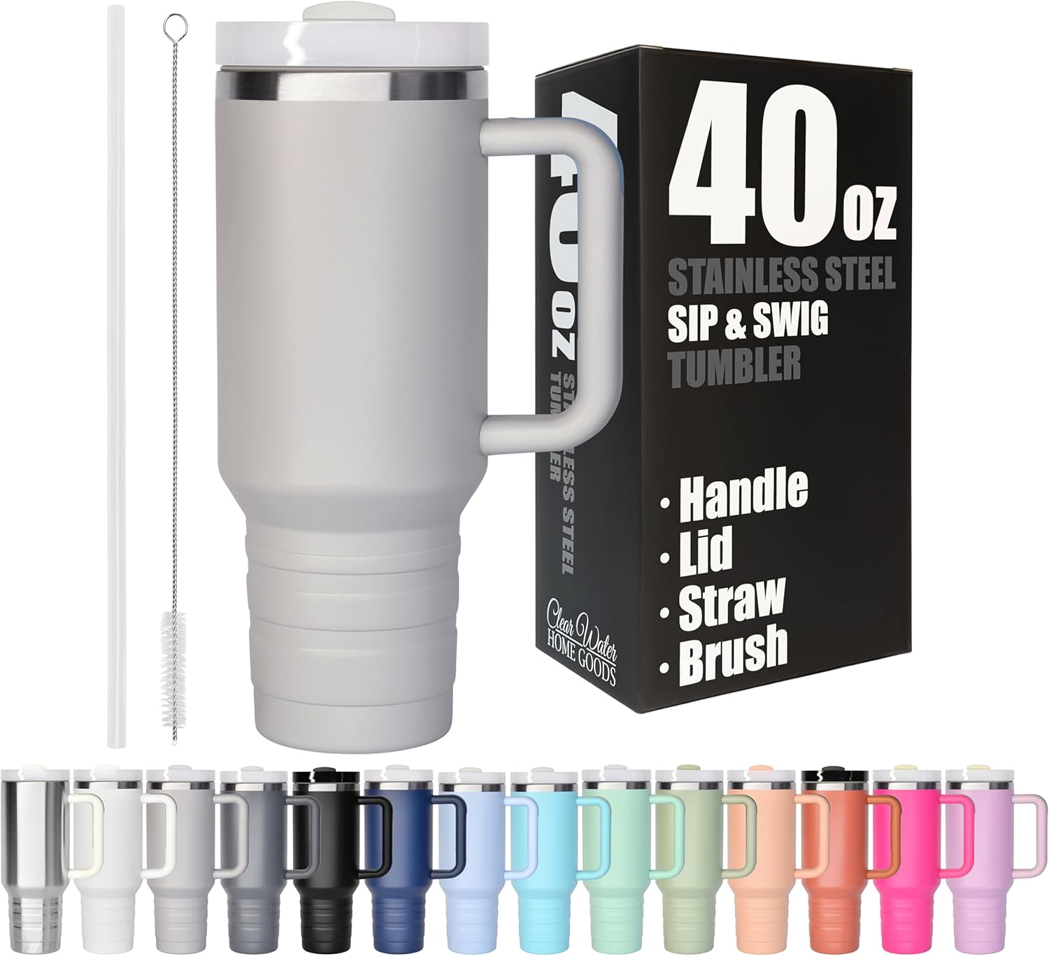 - 40 OZ INSULATED TUMBLER: Engineered with double-wall vacuum insulation, this 40 oz tumbler ensures your drinks stay hot or cold for hours. Its ergonomic handle and slim base make it ideal for most standard cup holders, perfect for travel and taking it on-the-go. The included leak-resistant lid, reusable straw and straw cleaning brush offer the ultimate hydration experience.
