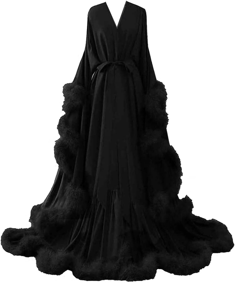 Changuan Feather Bridal Robe Silk Satin Robes Old Hollywood Long Bathrobe Lingerie Nightgown Sleepwear Maternity Photoshoot