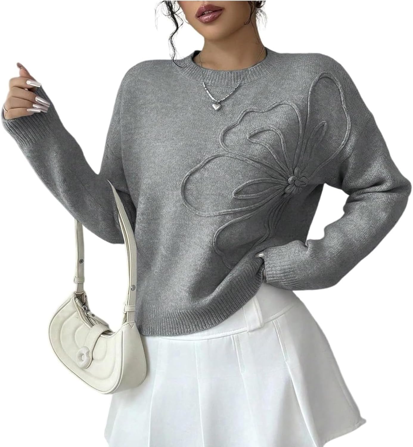 Women's 3D Floral Appliques Crewneck Sweaters Long Sleeve Drop Shoulder Pullovers Elegant Knit Tops