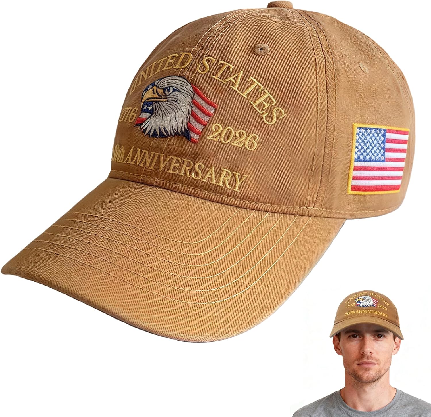 250th American Anniversary Hat, Adjustable USA Baseball Cap for Men & Women, Commemorative Eagle Embroidery Heritage Cap Khaki