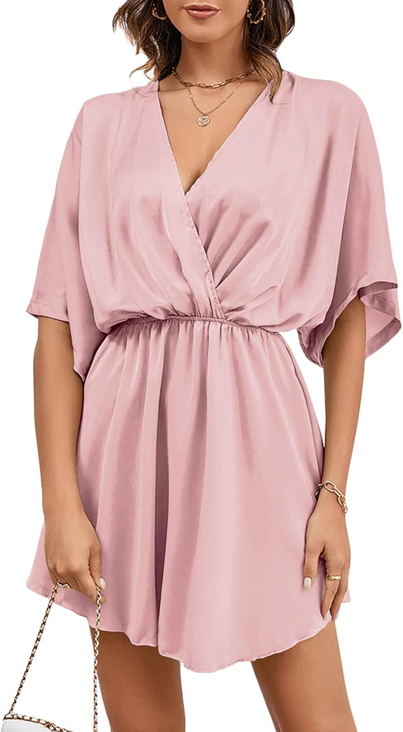 LYANER Women's Satin V Neck Twist Ruffle Flowy Swing Short Sleeve Elegant Mini Dress