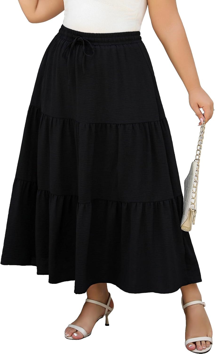 Women's Plus Size Long Maxi Skirt 1x-4x Elastic Waist Tie Drawstring Crinkle Flowy A-line Skirts with Pockets