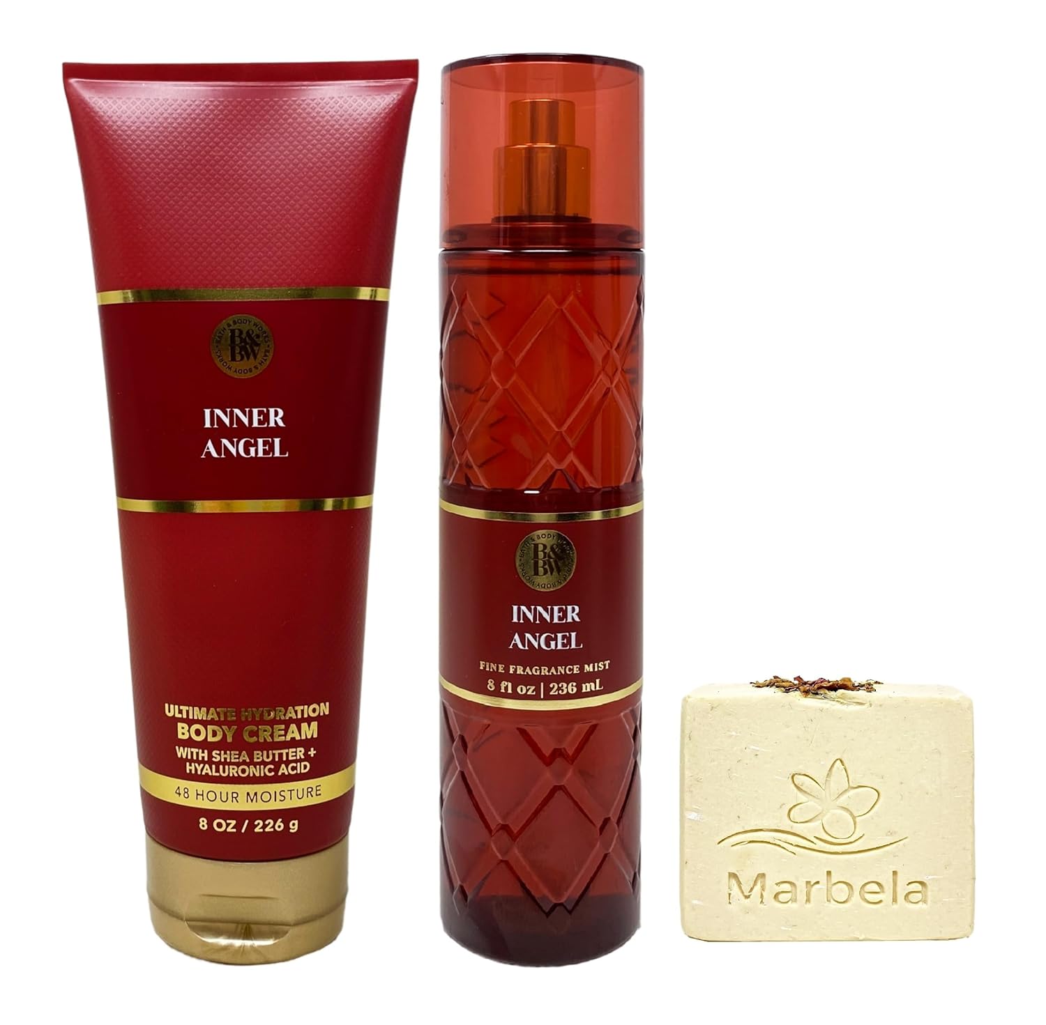 - Bath & Body Works Inner Angel Duo Set with a 4 oz Marbela Creamy Rose Bar Soap (Soap May Vary).