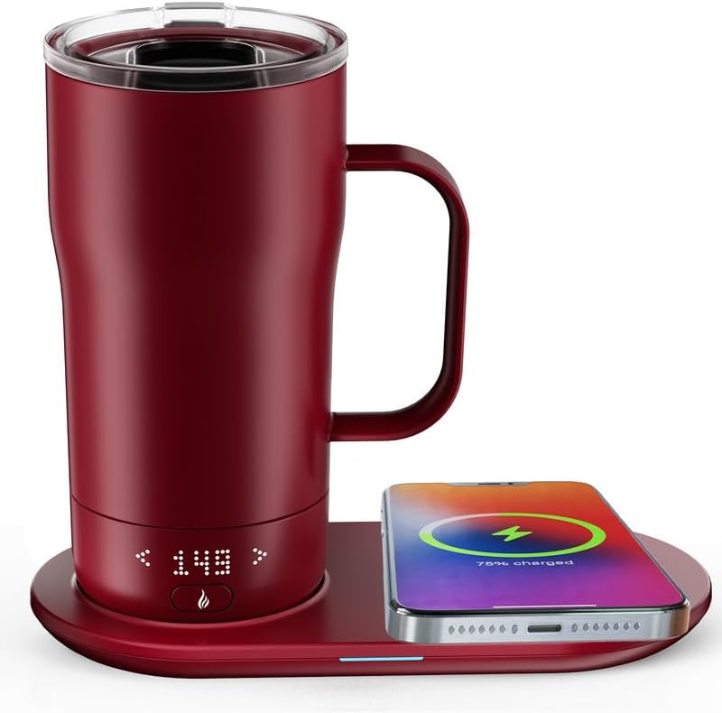 Smart Self Heating Coffee Mug 18 Oz Temperature Control Heated Coffee Mug App Controlled Warmer Mug 5-10 Hour LED Display Keep Coffee Hot All Day Fast Wireless Charger Base Rogue red