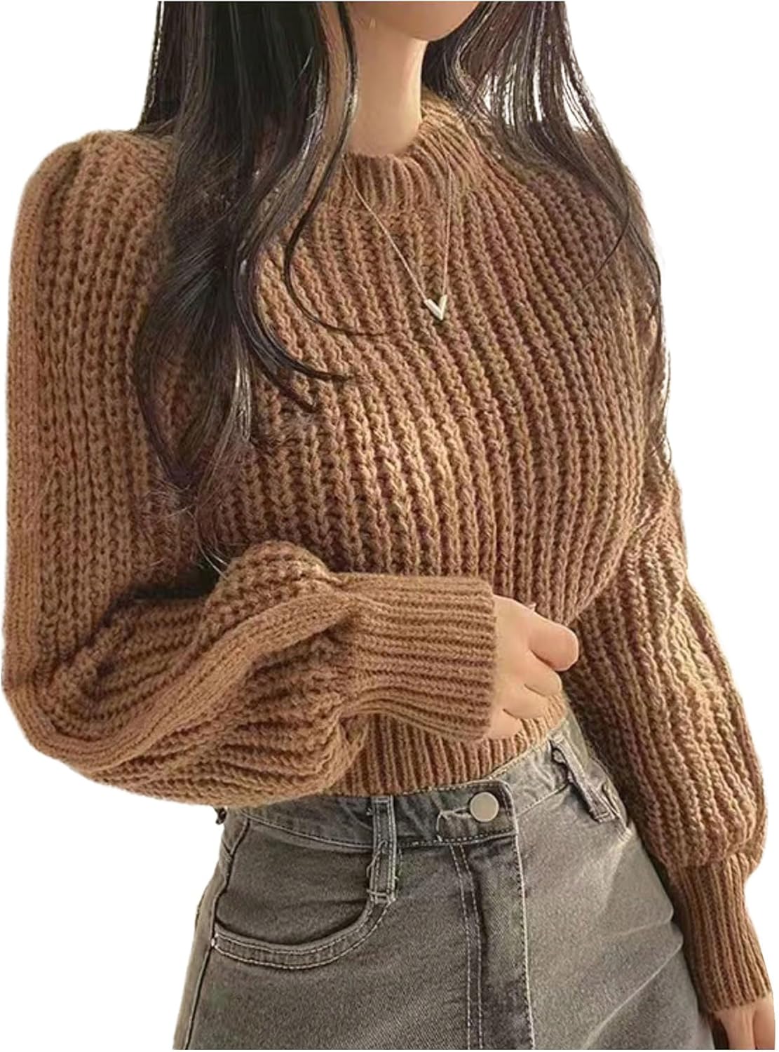 MakeMeChic Women's Cable Knit Crew Neck Sweater Long Sleeve Tight Hem Pullover Crop Tops