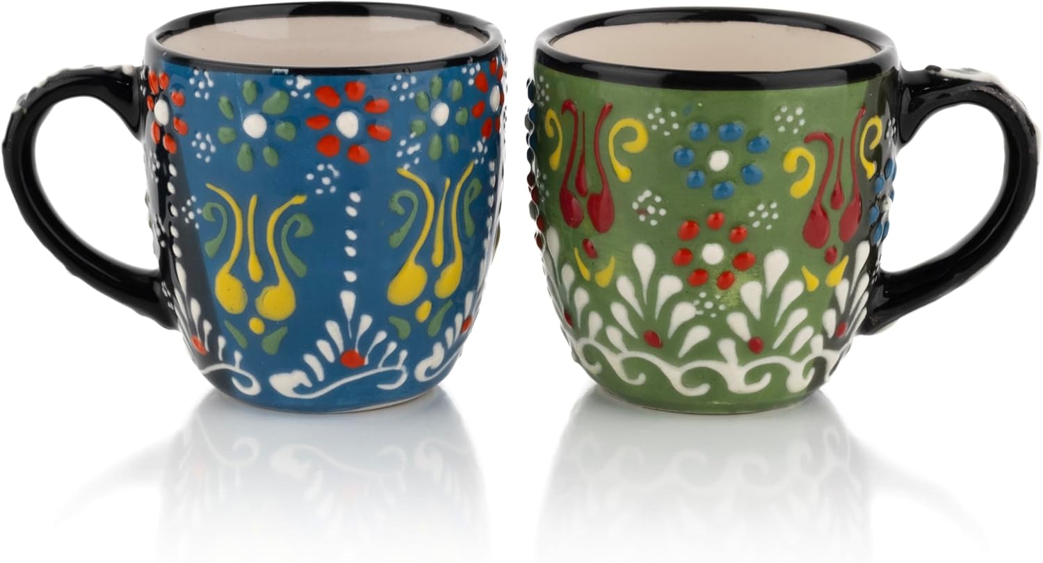 Espresso Cups Set of 2 | 4 oz Small Espresso Cups | Turkish Tea Cups | Demitasse Mugs with Handle | Modern Stackable Ceramic Espresso Mugs Set (Green/Blue)