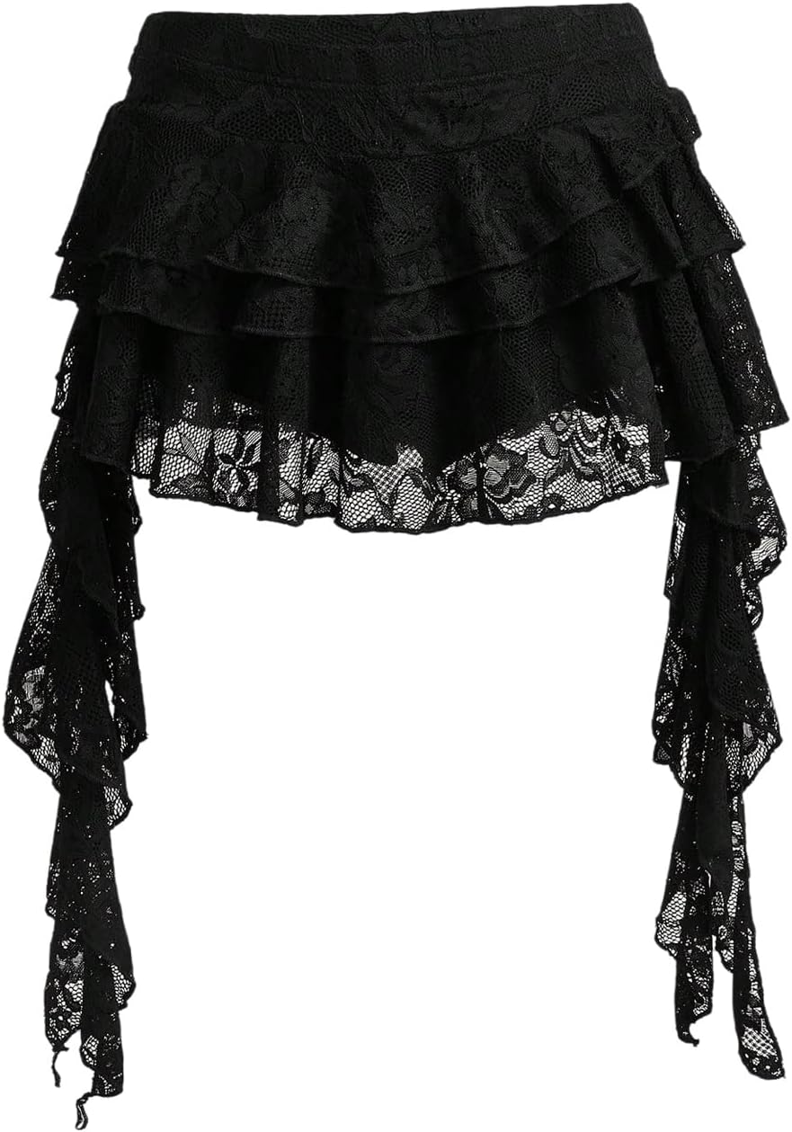 Women's Floral Lace Layered Ruffle Mini Skirt Low Rise Asymmetrical Going Out Skirts