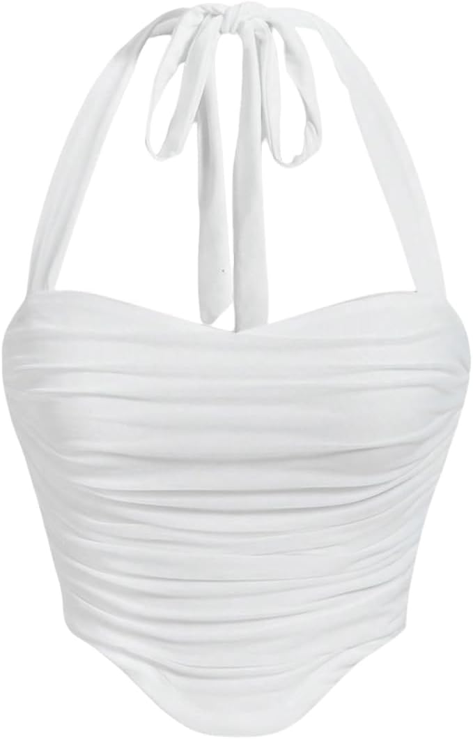Milumia Women Ruched Halter Top Tie Backless Asymmetrical Hem Cropped Tank Tops
