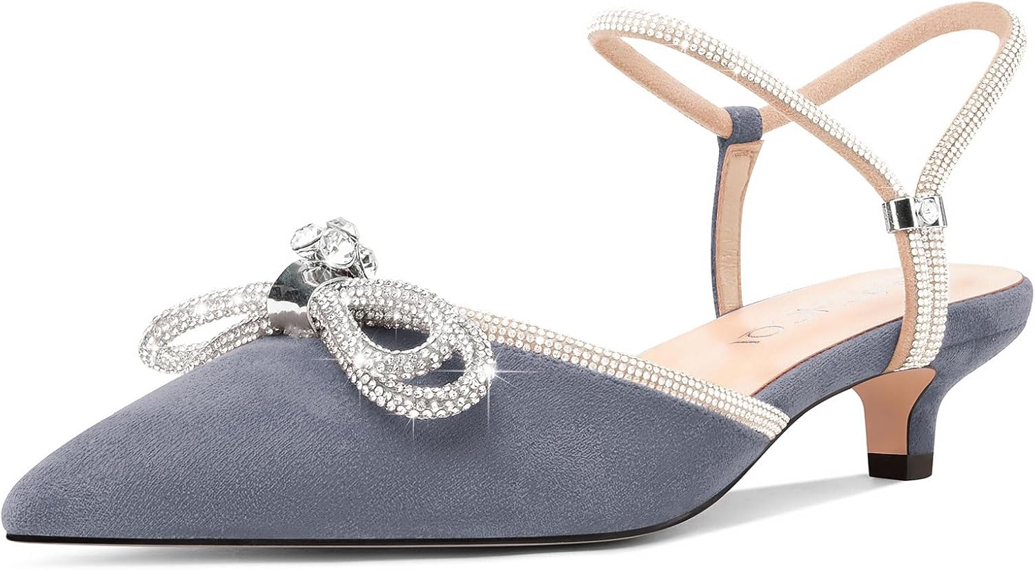 Peijely Women's Rhinstone Wedding Low Heel Slingback Kitten Heels, Adjustable Strap Pointed Toe Bow Pumps Prom Dress Shoes