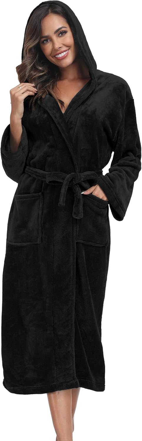 Womens Hooded Plush Bathrobe Warm Fleece Soft Long Robe Fuzzy Full Length Gown Shower Spa House Kimono for Women