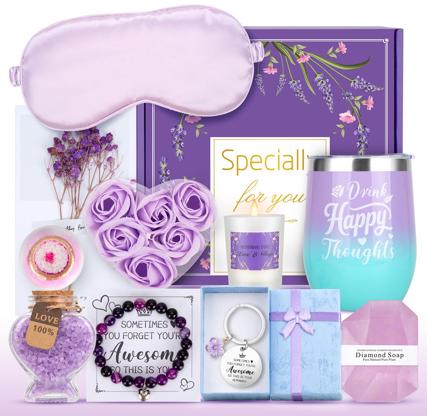 - 11 PCS BIRTHDAY GIFT FOR WOMEN: Are you still struggling to choose a wonderful gifts? Come and take a look at this birthday gifts for women that we have exquisitely designed for you! COPETLIFE self care spa gifts basket for women, designed to pamper and delight every lady. Come with 1* 12oz insulated tumbler, 1*bath bomb,1*bath salts, 1*silk eye mask, 1*handmade soap, 1*floral soap,1*natural stone bracelet, 1*scented candle,1*exquisite keychain,1*gift card and 1*gift box. Just pamper her with this self care kit spa kit