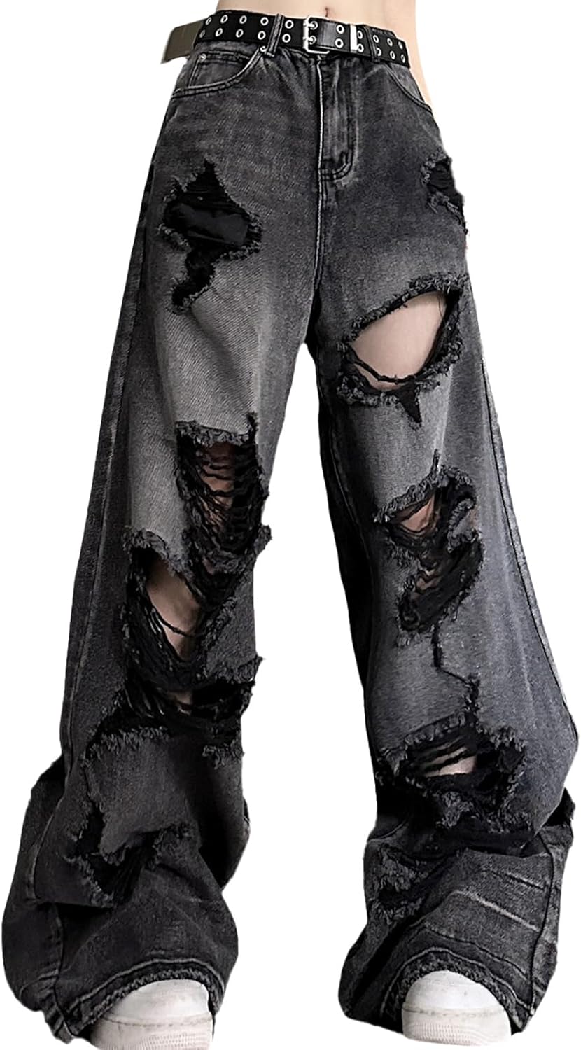 Women's Retro Casual Pants American y2k Sweet Cool Street Style Black Loose Wide Leg Straight Leg Ripped Jeans