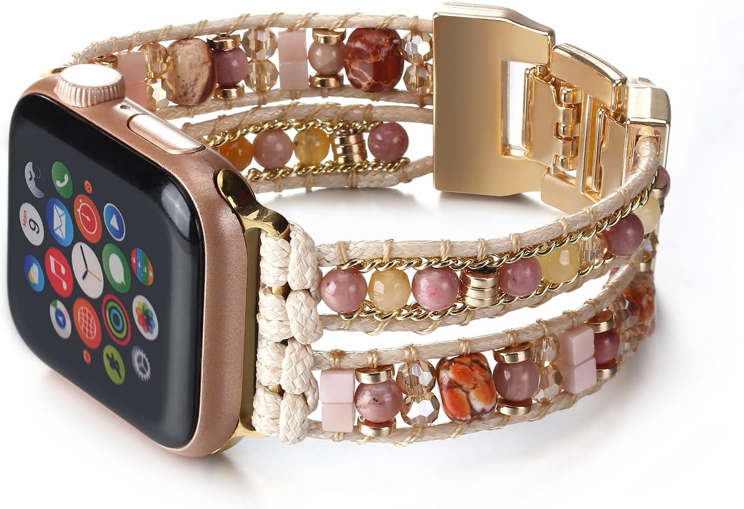 Boho Beaded Bracelet Compatible with Apple Watch Band for Women Men 38mm 40mm 41mm 42mm 44mm 45mm 46mm 49mm - Handmde Natural Stone Leather Multilayer Wrap Apple Watch Strap iWatch Band Series 11 10 9 8 7 6 5 4 SE 3 2 1 Ultra 2 3