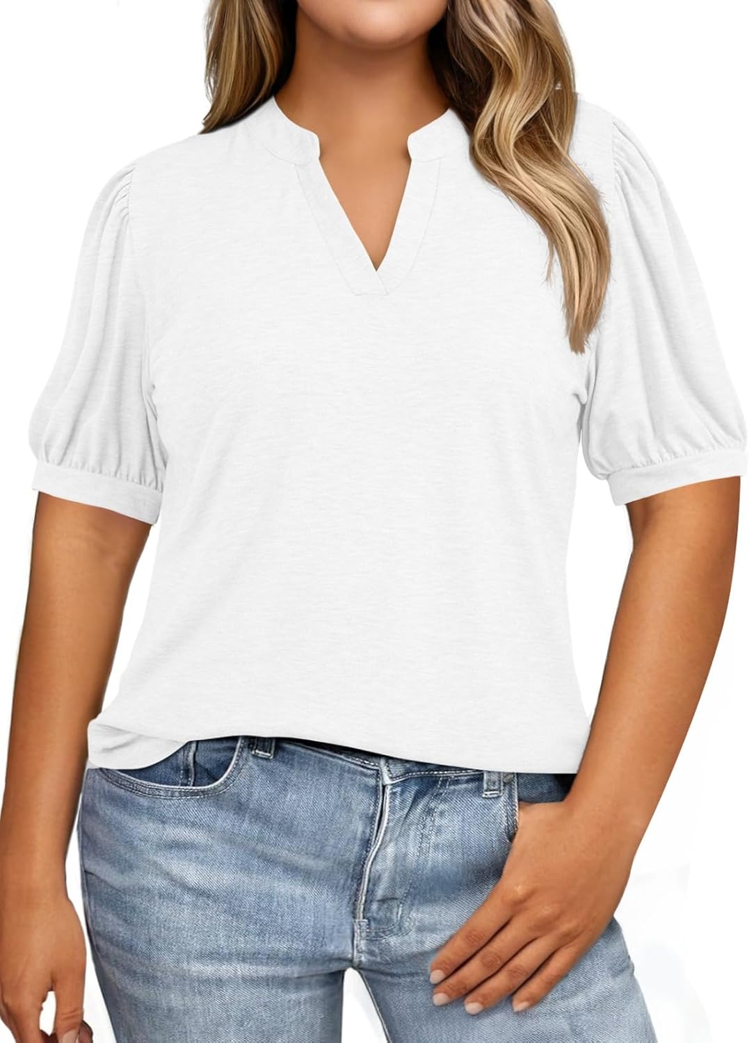 Eytino Womens Plus Size Tops V Neck Puff Short Sleeve Summer Loose Casual Solid Tees Shirts(1X-5X)