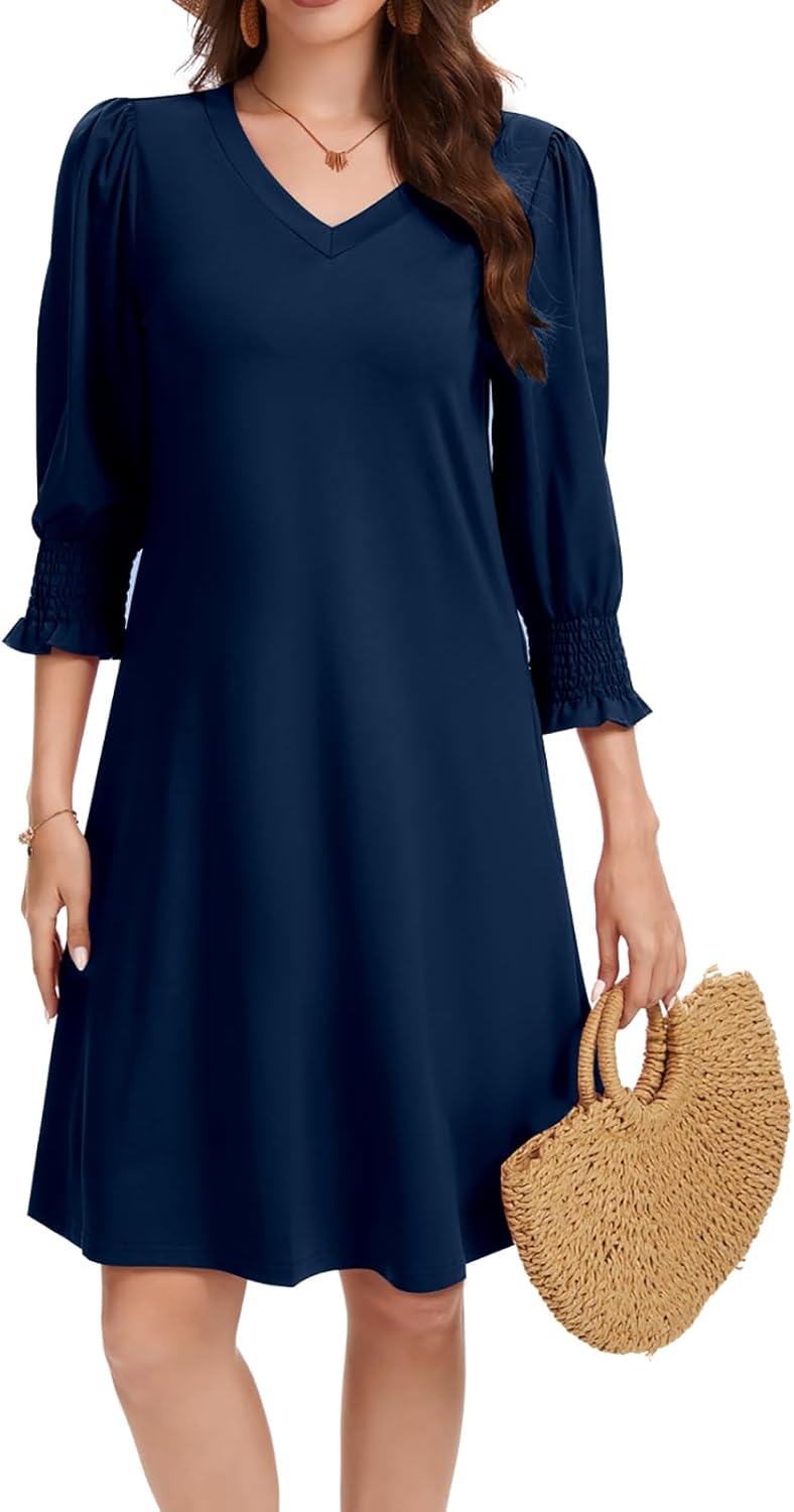 Women's Casual Loose Midi Dress V-Neck Fluffy Sleeves Ruffle Cuffs with Pockets