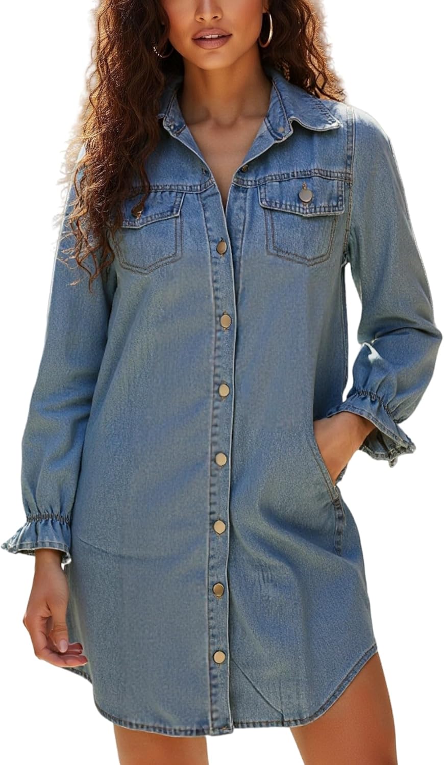 Unifizz Women's Denim Shirt Dress Button Down Collar V Neck Long Sleeve Cotton Blue Jean Dress