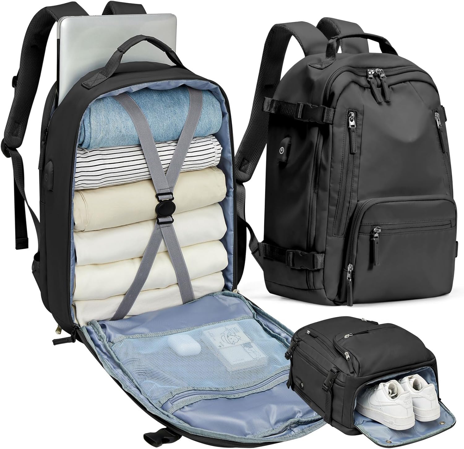 BJLFS Travel Backpack for Women Men, Carry On Backpack with USB Charging Port & Shoe Pouch, TSA 15.6inch, Flight Approved, College Nurse Bag Casual Laptop Daypack for Weekender Business Hiking,Black