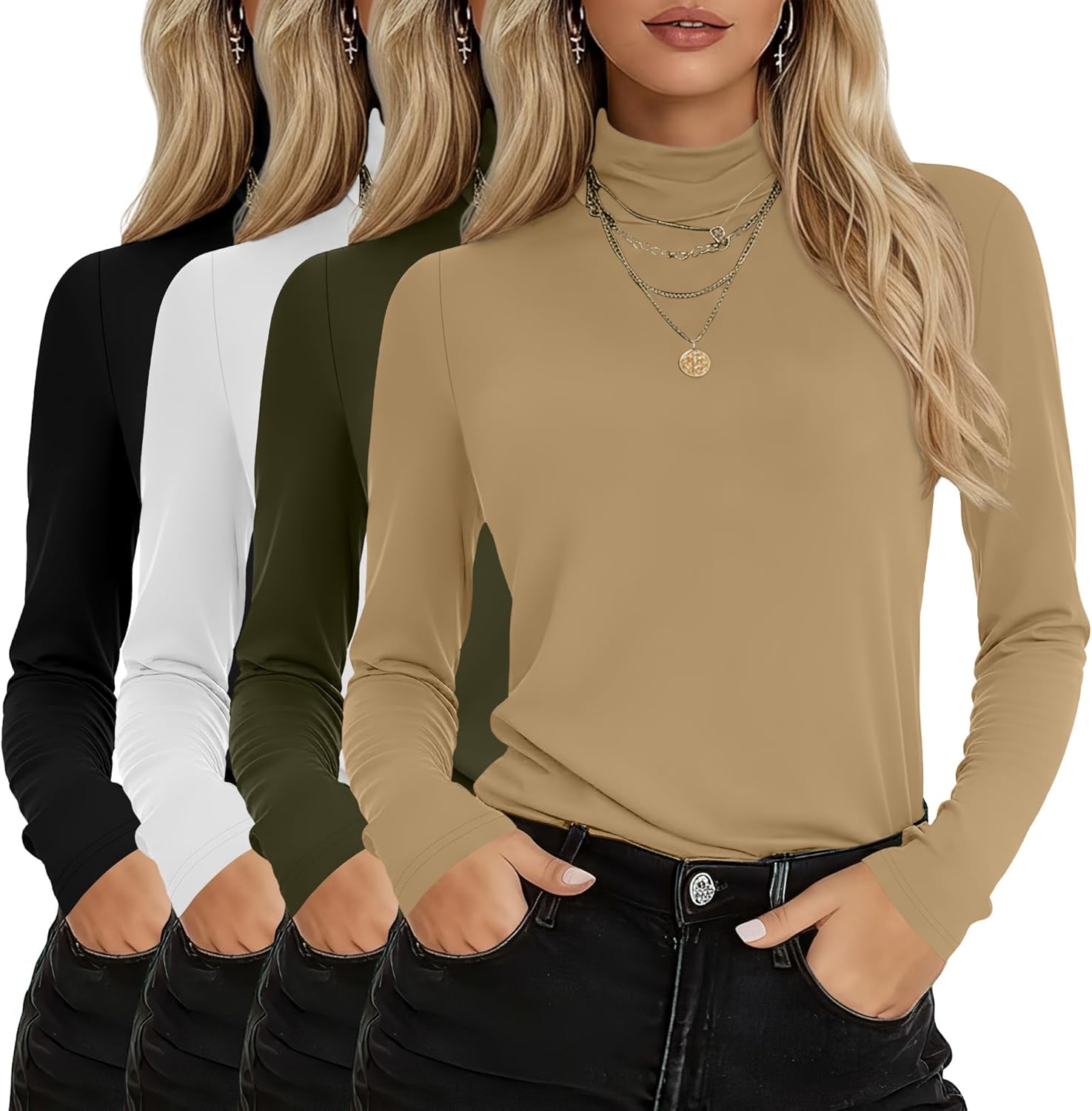 Huukeay 4 Packs Women's Turtleneck Tops Long Sleeve Shirts Mock Turtleneck Basic Tees Lightweight Slim Fit Casual Undershirt