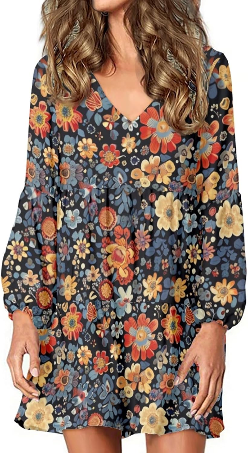 Long Sleeve Dress for Women Floral V Neck Lantern Sleeve Fashion Tunic Dress Knee Length Casual Swing Shift Dress