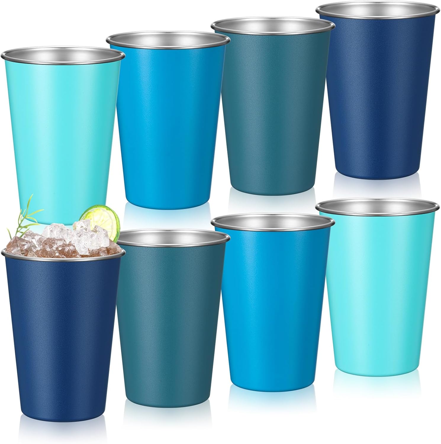 Baderke 8 Pack 16 oz Metal Cups Gradient Pink Blue Stainless Steel Cups 4 Color Stackable Pint Tumbler Drinking Glasses for Travel Camping Outdoors, Unbreakable(Gradient Blue)