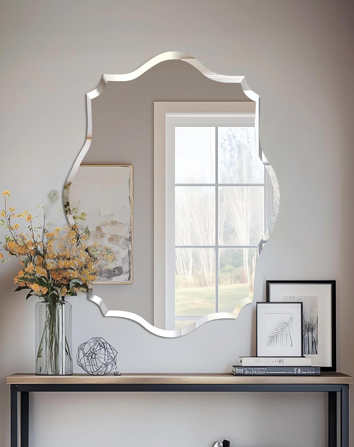 - Art Deco Glass Mirror - Elegant and decorative mirror 28 x 20 inch, A piece of scallop shaped thick and clear glass, Frameless design creates a sleek and modern touch, that can add some glamour and sophistication to your spaces. Easy to integrate into different rooms, Perfect wall mount vanity for bathroom, bedroom, living room, dining room, or entryway