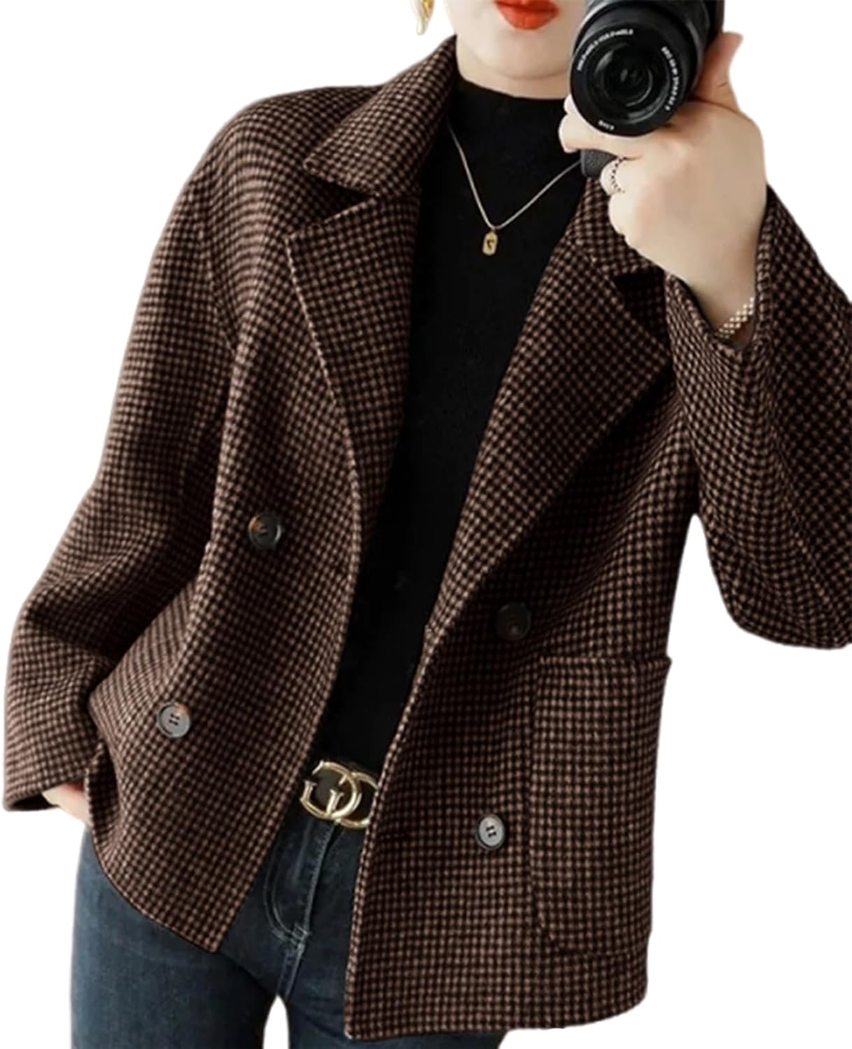 utcoco Womens Cropped Wool Coats Houndstooth Double Breasted Short Wool Pea Coat Cropped Blazer Jackets with Pocket