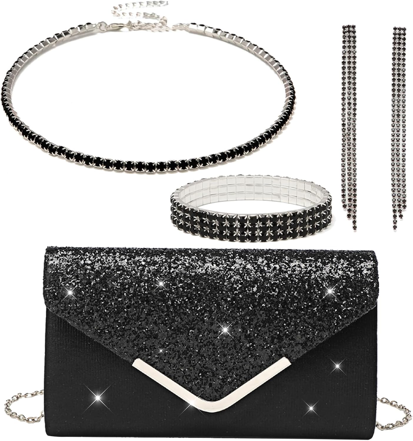 YYW 4 Pieces Women Evening Handbags Clutch Purse Bag with Rhinestone Crystal Jewelry Set for Wedding Party