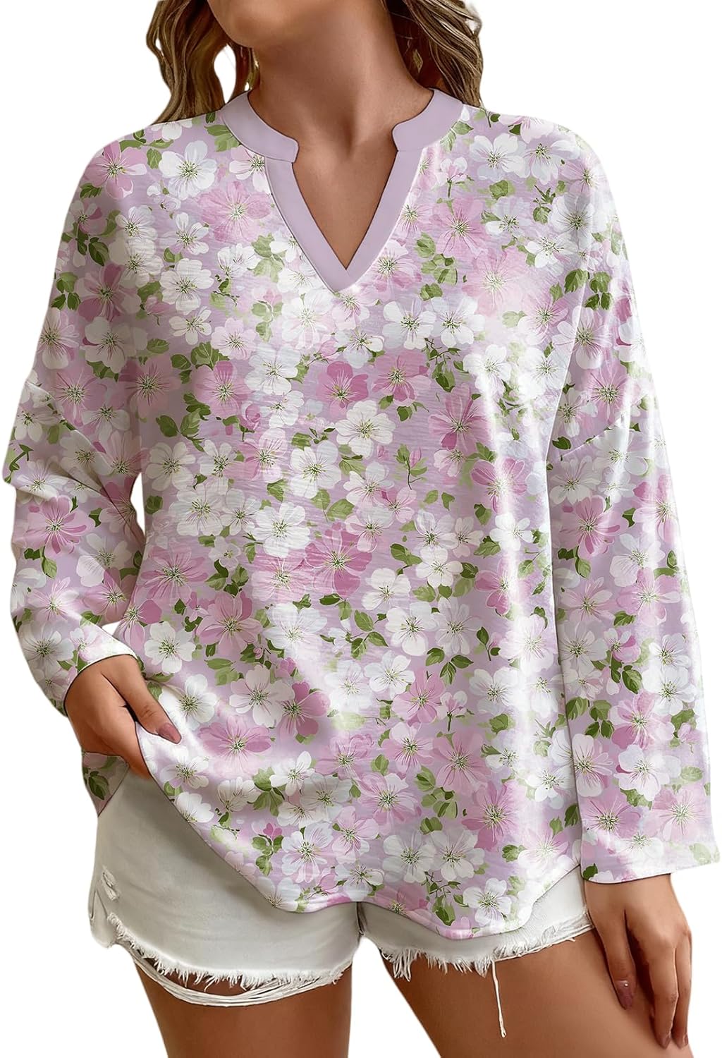 Women V Neck Floral Print T Shirt Oversized Long Sleeve Lightweight Breathable Spring Casual Trendy Tops