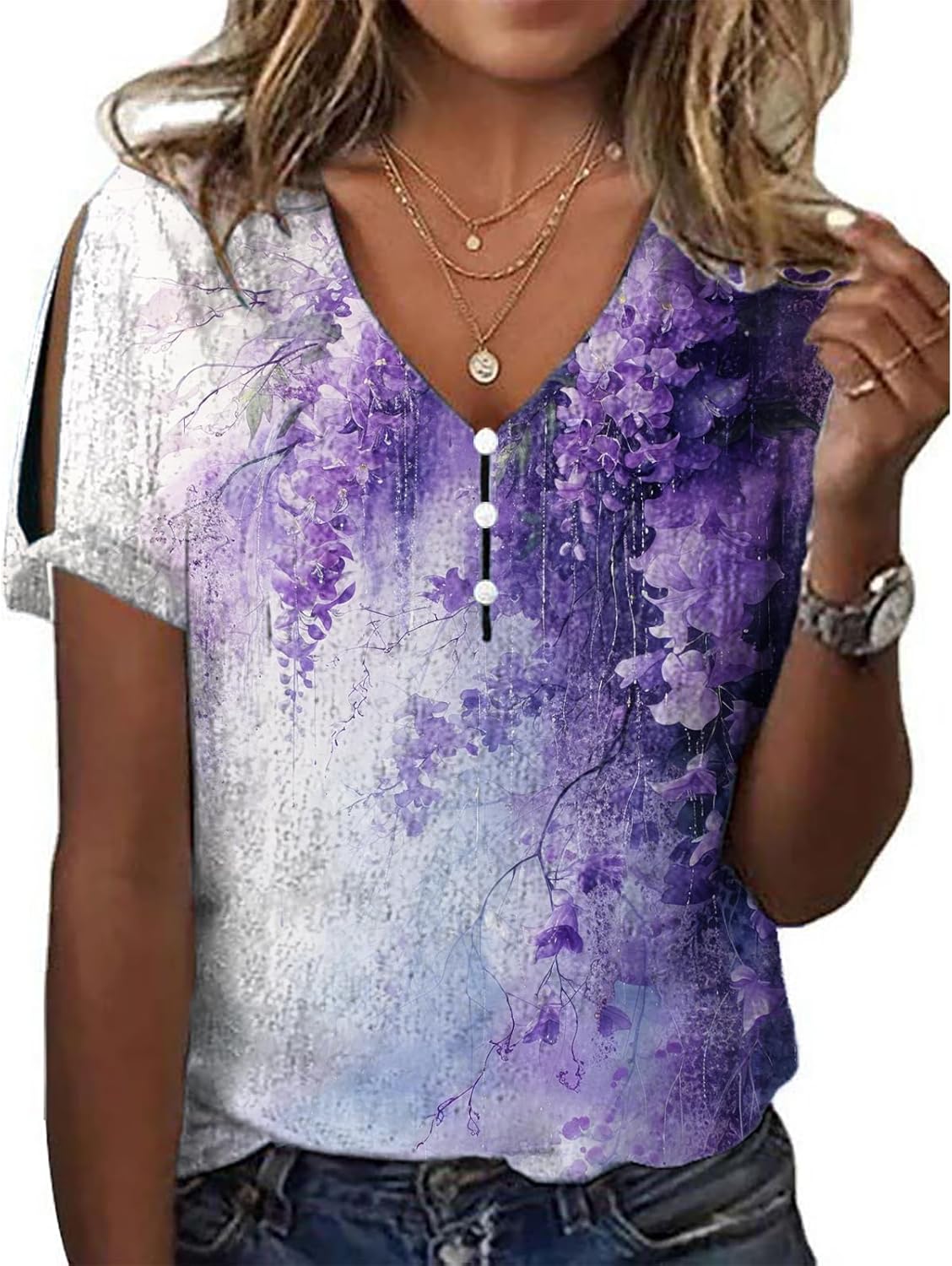 Floral Boho Tops for Women V Neck Button Short Sleeve Casual 2025 Summer Fashion Cold Shoulder Comfy Tunic Tshirts