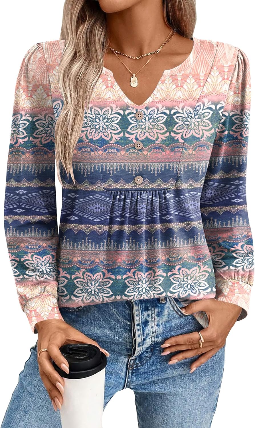 Zeagoo Long Sleeve Shirts for Women 2025 Casual Pleated V Neck Fall Tunic Tops Button Down Blouse Dressy Loose T-Shirts