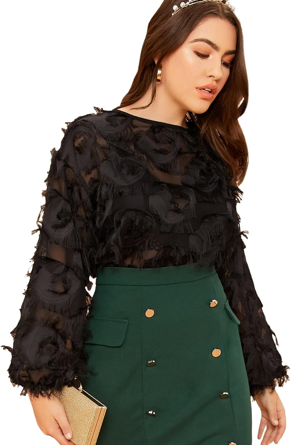 WDIRARA Women's Plus Sheer Long Lantern Sleeve Boat Neck Elegant Party Fuzzy Blouse Top