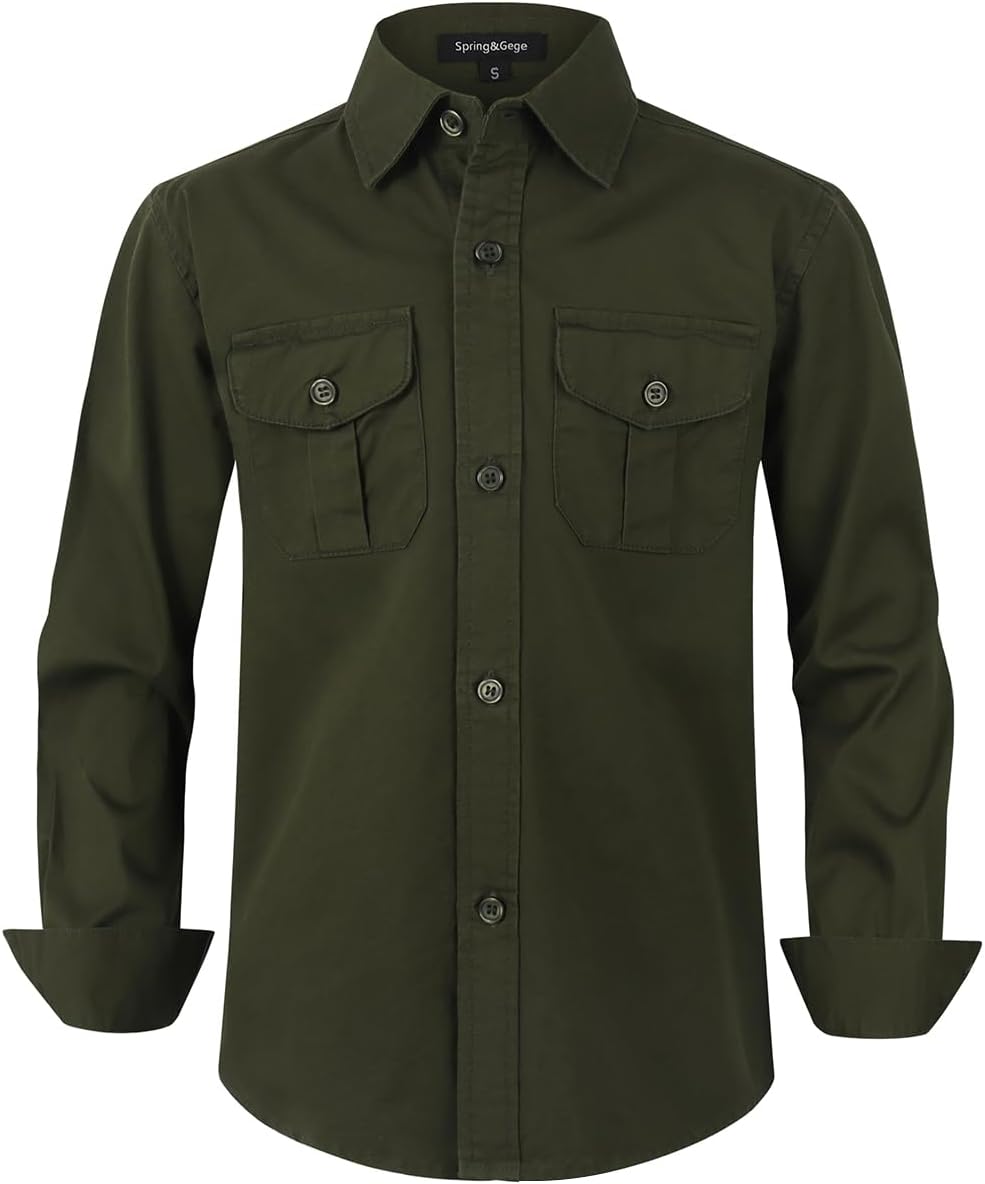 Spring&Gege Boys' Long Sleeve Button Down Shirt for Kids Woven Solid Two Pockets