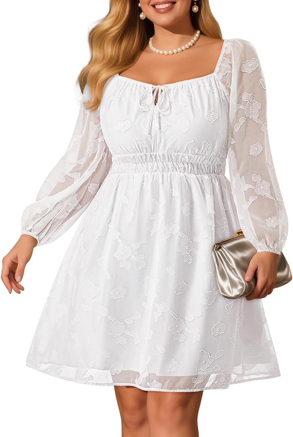 Pinup Fashion Plus Size Wedding Guest Dress 2025 - Graduation Spring Long Sleeve Floral Lace Short Dress