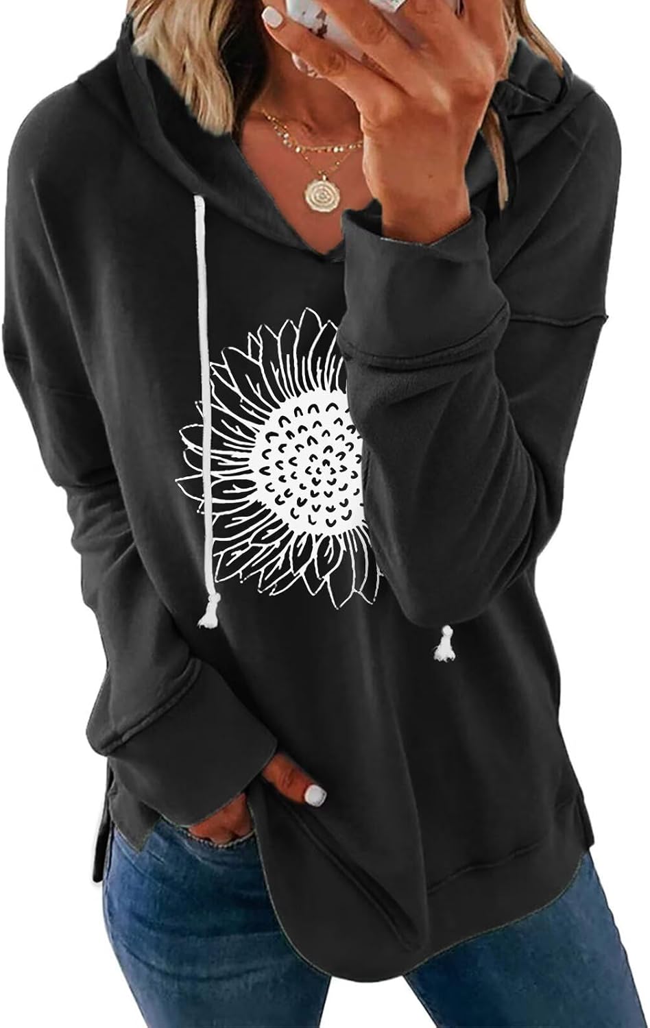 Women Sunflower Graphic Hoodies Long Sleeve Pullover Drawstring Sweatshirt Loose Fit Tunic Tops