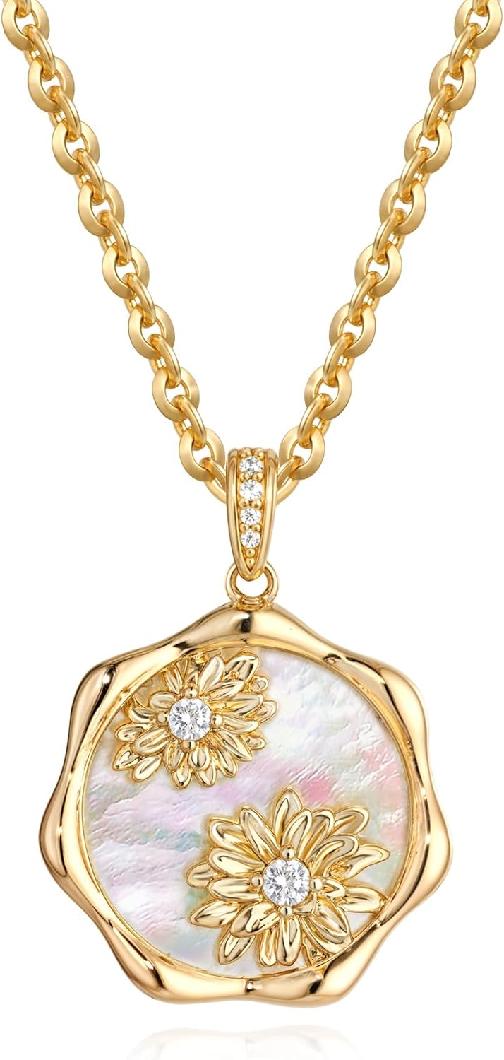 MTMY Birth Flower Necklace 14K Gold Plated Mother of Pearl Disc Birth Month Flower Pendant Necklaces for Women Personalized Custom Floral Jewelry Birthday Gift